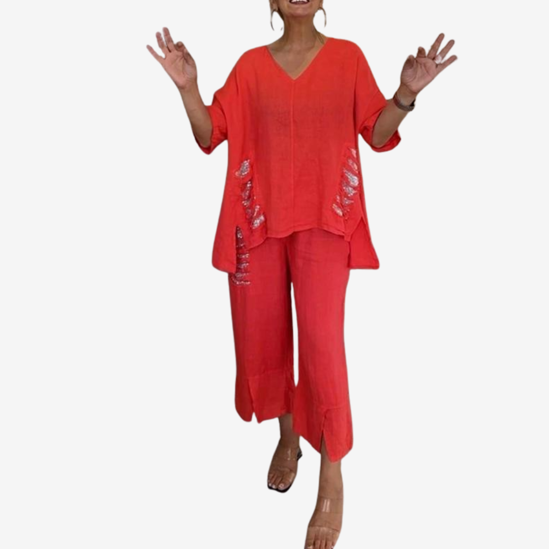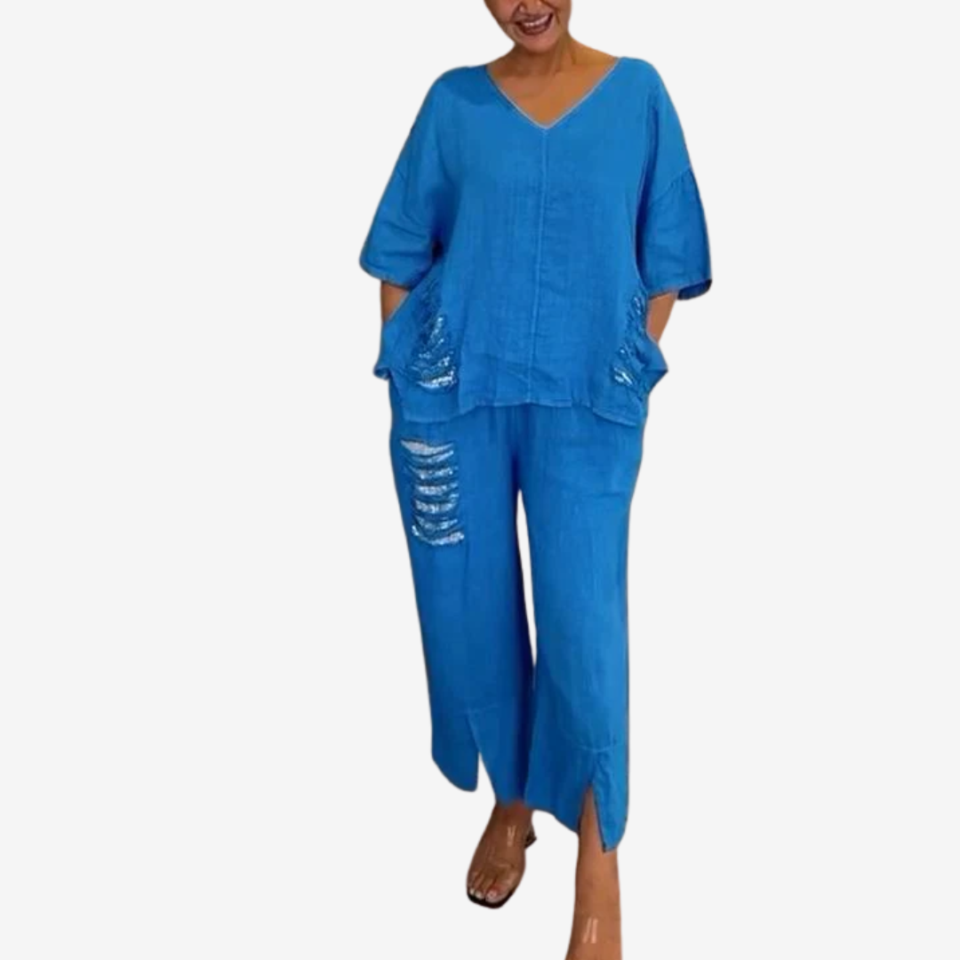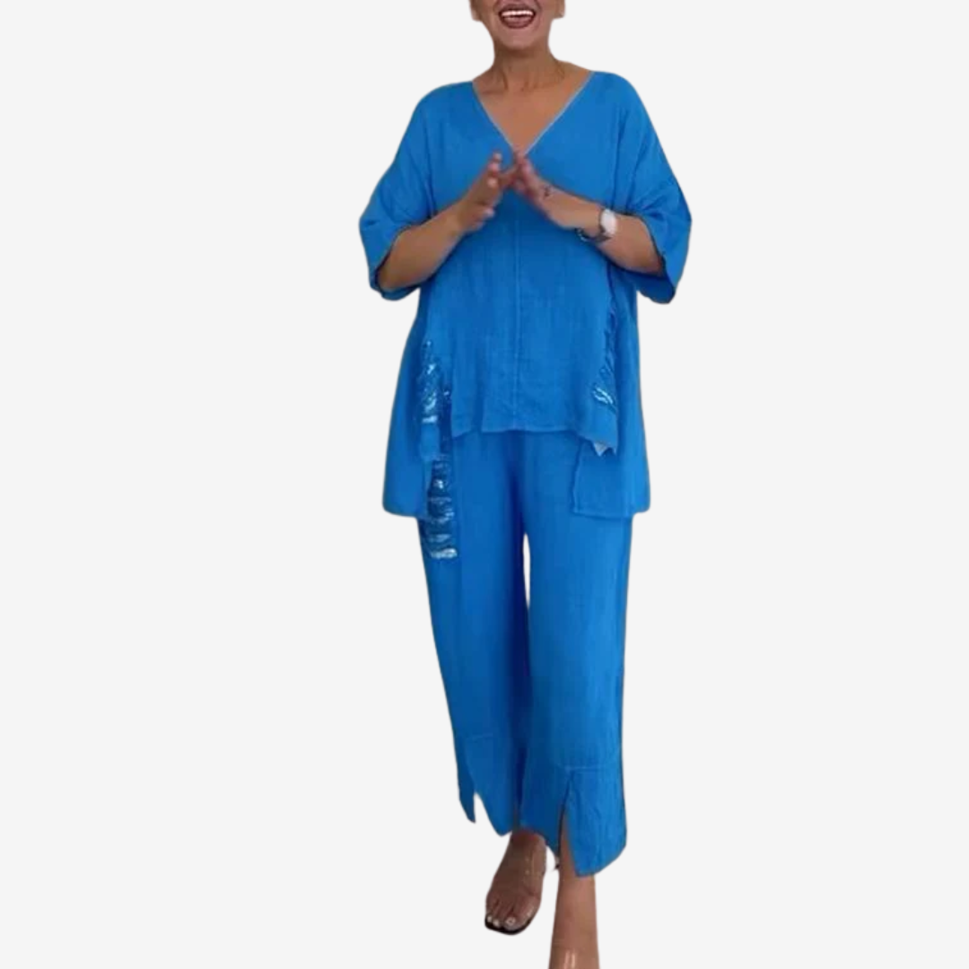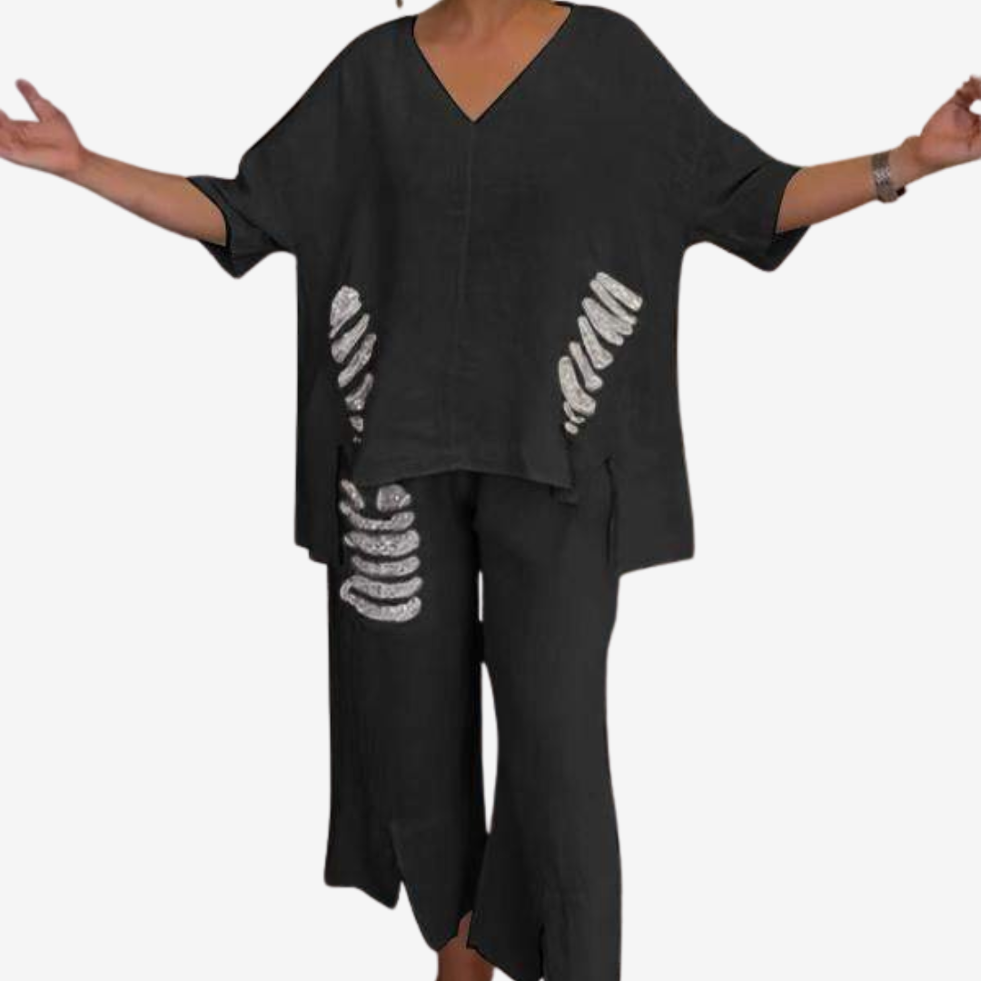 L'ensemble deux pièces Auroria™ allie confort et style décontracté. Composé d'un haut ample et fluide aux broderies délicates et d'un pantalon large assorti, cet ensemble offre une silhouette chic qui convient à toutes les occasions. Que ce soit pour se détendre avec style, profiter d'une journée en ville ou ajouter une touche décontractée à vos soirées, sa matière respirante et sa coupe flatteuse en font un indispensable de votre garde-robe. Disponible dans une gamme de couleurs vives et neutres, Auroria™ s'adapte à votre humeur et à vos projets.