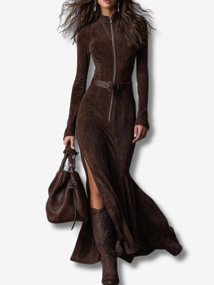 Découvrez Carla, la robe longue vintage avec ceinture et fermeture éclair, une pièce qui sublime la féminité moderne tout en préservant une touche classique.