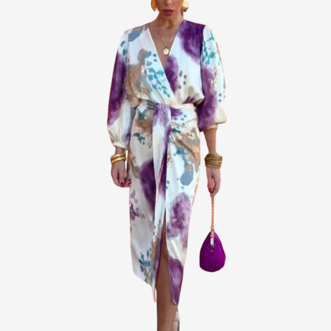 Sublimez votre tenue de soirée avec Irène™, une sublime robe longue en satin à l'élégance raffinée. Dotée d'un décolleté en V drapé à surplis, de manches longues bouffantes gracieuses et d'une ceinture à nouer à la taille, cette robe est ornée d'un imprimé aquarelle abstrait et onirique, où les tons prune, bleu sarcelle et or se mêlent sur un fond ivoire. Sa silhouette fluide flatte toutes les silhouettes, créant une allure aérienne, inspirée de l'art, parfaite pour les mariages, les réceptions ou les dîners raffinés.